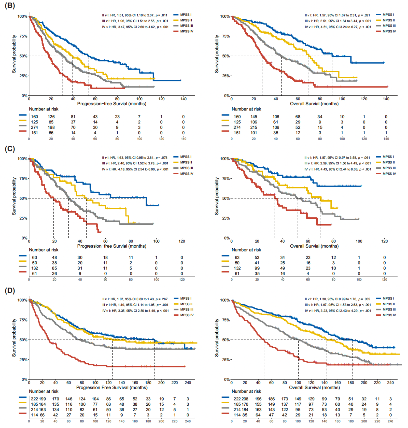结果表明,训练队列中患者血小板减少、乳酸脱氢酶升高、国际分期系统(ISS)III期、高危遗传学异常(HRA)的数目具有独立预后意义。根据不同因素的总生存期(OS)危险比进行赋分(血小板减少2分、乳酸脱氢酶升高1分、ISS III期2分、1个HRA 1分、≥2个HRA 2分),可将训练队列中患者分为4组:MPSS Ⅰ期(22.5%,0分)、Ⅱ期(17.6%,1分)、Ⅲ期(38.6%,2-3分)和Ⅳ期(21.3%,4-7分)。不同风险组患者的预后存在显著差异,MPSS I期至IV期组患者的中位OS分别为91.0、69.8、45.0和28.0个月(P<0.001)。同时,MPSS模型在内部验证队列和外部验证队列中均显示出卓越的预后价值,显著优于经典预后模型(R-ISS、R2-ISS和MASS)。