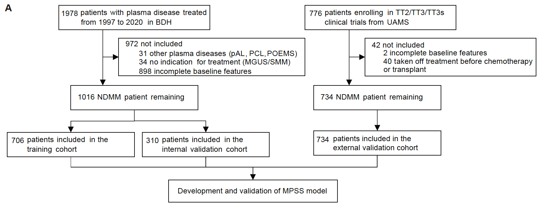 该研究共纳入了来自中国医学科学院血液病医院(中国医学科学院血液学研究所)和TTs临床试验队列中的2754例MM患者,最终将其中1940例具有完整基线资料的初诊MM患者纳入分析。其中,血液病医院队列中的1016例患者通过7:3随机分组,706例患者作为训练队列,310例患者作为内部验证队列,而TTs队列的734例患者则作为外部验证队列。